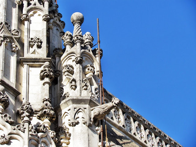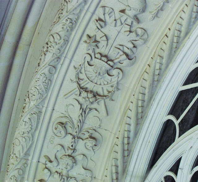 On the ground floor of the three-storey west facade there is a pointed arched window with a rope crown. On the first floor, on the right side, there are two windows in the form of three lobes, between which there is a coat of arms with three fleurs de lis, connected by a recessed arch segment. On the left there are two arched windows similar to those at the rear of the east facade. The second floor is divided by four windows in the shape of pointed arches, which are crowned with cord friezes. The upper floors are flanked by a tripartite, two-story window crowned by two armillary spheres in the arch panels and a central oculus. A fluted cornice forms the conclusion.