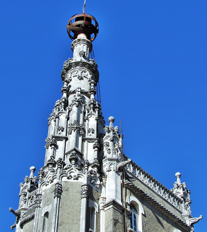 The three-storey building, which now houses the palace hotel, is built in the neo-Manueline eclectic style and has an observation tower surrounded by a gallery as a decorative highlight. There are decorative motifs in Ançã stone from the Belém Tower, motifs from the cloister of the Jeronimos Monastery in Lisbon, as well as arabesques and decorations from the Convent of the Knights of Christ in Tomar, alluding to a Flamboyant Gothic style with romantic episodes and form a contrast to the monastic austerity.